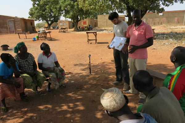 Edouard Lehmann (debout, tenant des affiches) et un traducteur ont délivré en décembre 2017 des mesures de protection aux villageois ayant participé à l'enquête scientifique. © EPFL / GR-CEL