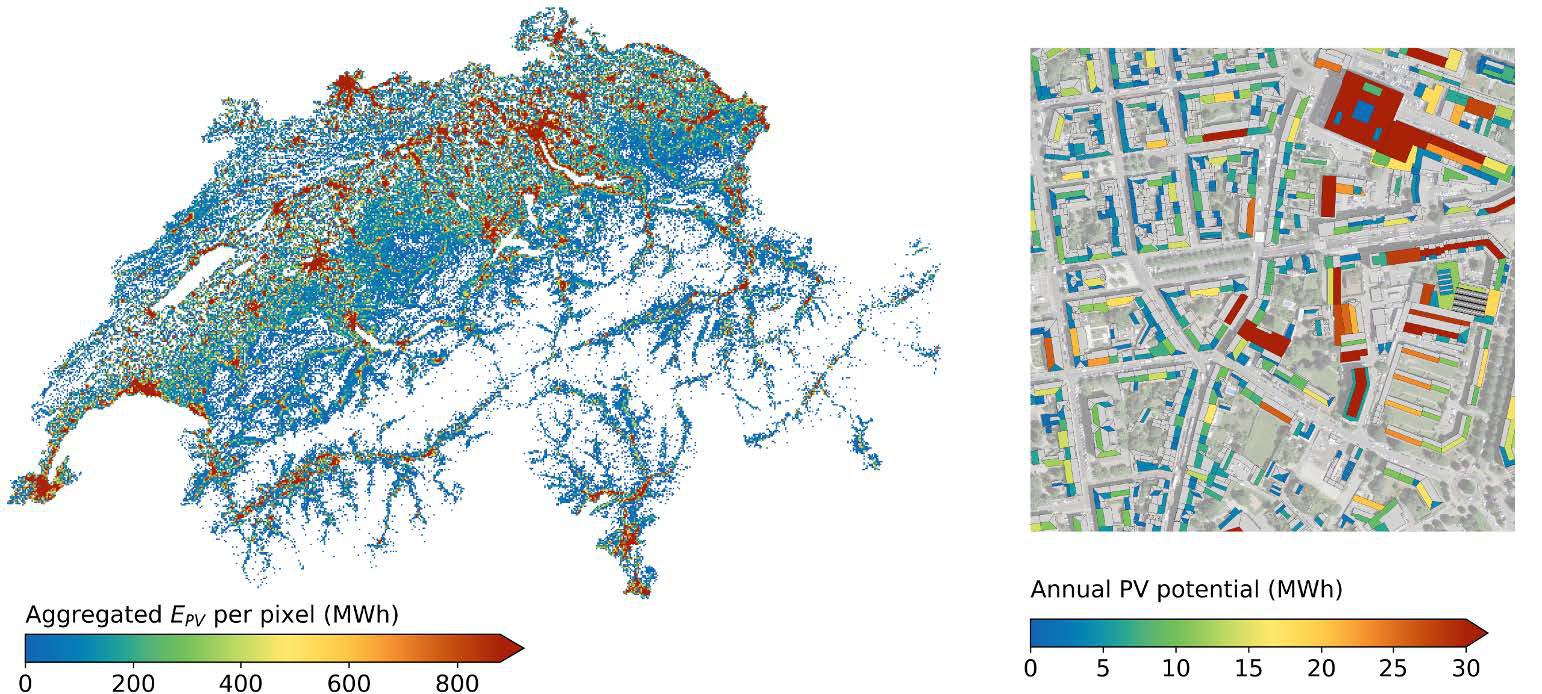 Le déploiement à grande échelle du photovoltaïque sur les toits des bâtiments peut jouer un rôle important dans la transition vers un système énergétique à faible émission de carbone. Jusqu’ici, le manque de données sur les bâtiments et leurs environnements ainsi que de grandes incertitudes – liées aux méthodes de calcul existantes – entravaient l'estimation précise des potentiels photovoltaïques à grande échelle sur les toits suisses. Pour combler cette lacune, les chercheurs du Laboratoire d’énergie solaire et physique du bâtiment (LESO-PB) ont développé une méthodologie qui combine des algorithmes d'apprentissage automatique (machine learning), des systèmes d'information géographique (GIS) et des modèles physiques pour estimer le potentiel photovoltaïque suisse. Ils ont également pris en compte, pour la première fois, le profil horaire. Leurs résultats sont publiés dans Applied Energy.