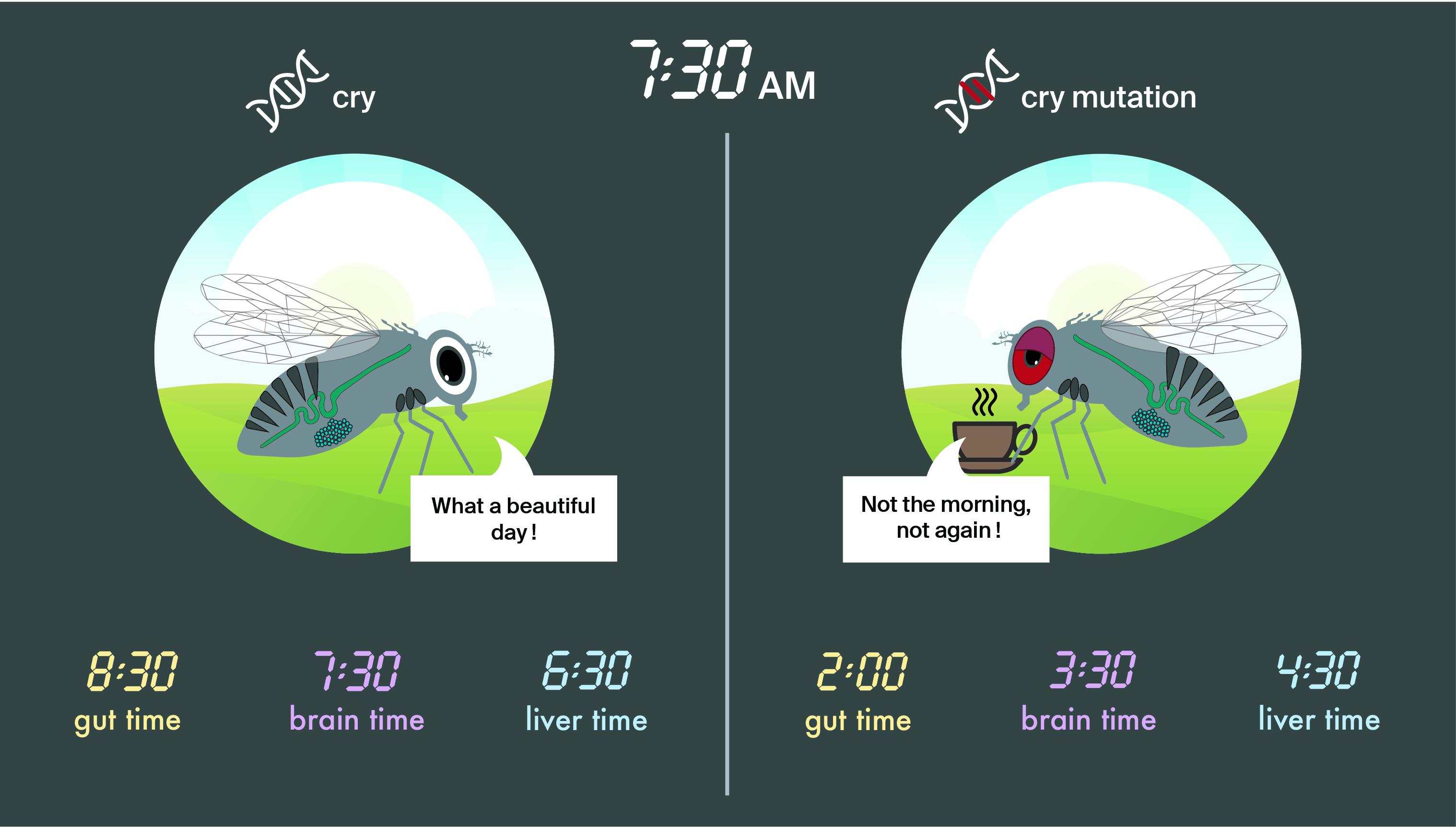 Focusing on a Drosophila line with the highest unaligned circadian rhythm (more than 10 hours), the researchers found that it contains a novel, loss-of-function deletion in the Drosophila clock- and light-regulated gene “cry” (for “cryptochrome”).