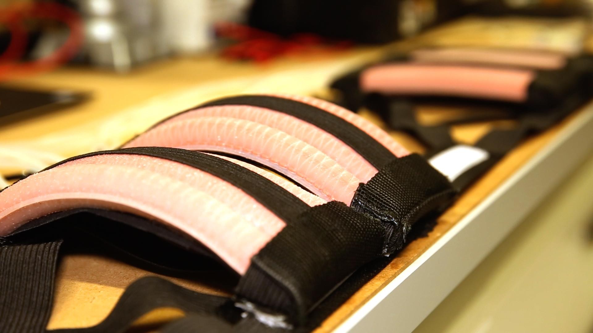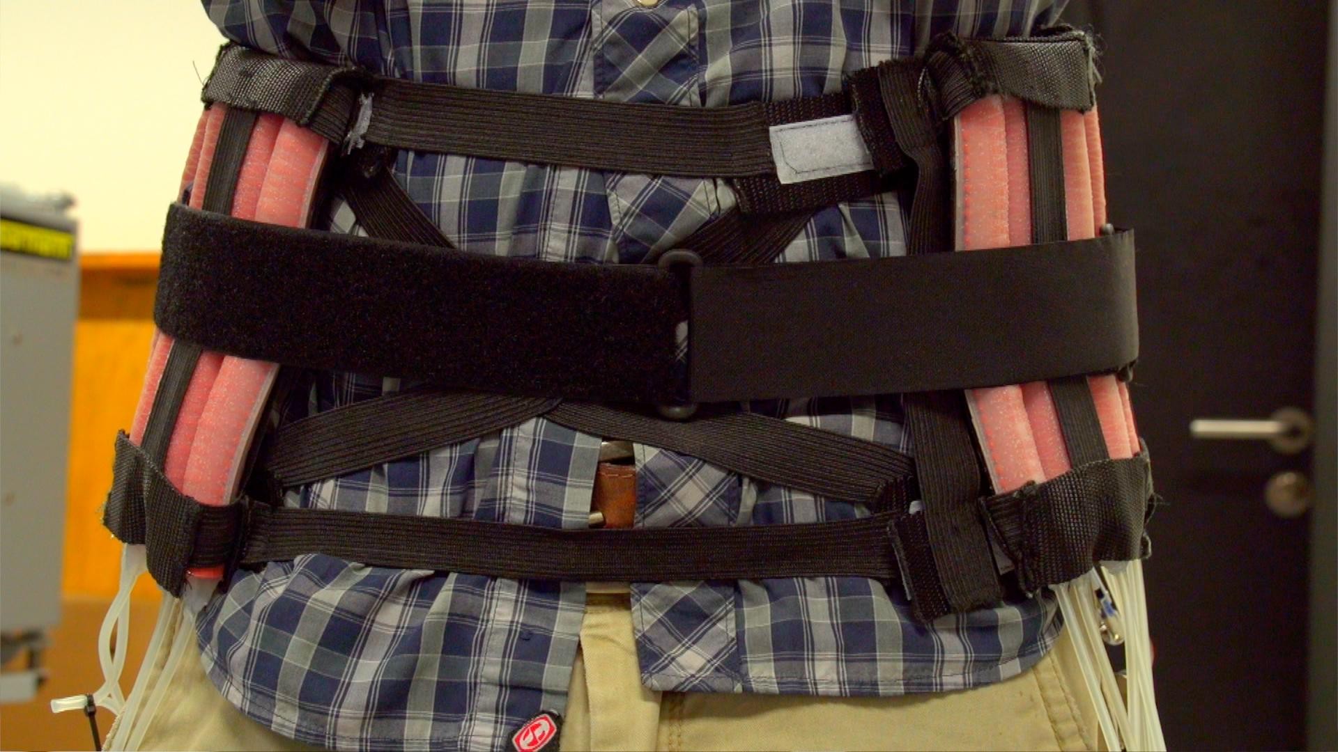 The belt’s soft actuators are made of pink rubber and transparent fishing line. The placement of the fishing line guides the modules’ deformation very precisely when air is injected. “For now, the belt is hooked up to a system of external pumps. The next step will be to miniaturize this system and put it directly on the belt,” said Robertson.